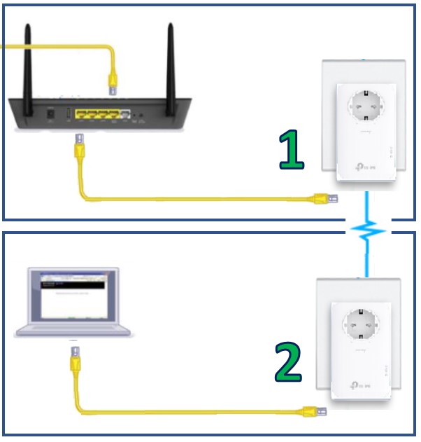 For å koble inn strømnettet settes en spesiell boks i stikkontakten ved ruteren og en tilsvarende boks hvert sted man vil ha nettverk. Det går da en RJ45 fra ruteren og inn i boksen som står i stikkontakten. Så kan man sette slike bokser hvor man vil i huset og koble til RJ45 ledninger der. Se figur lenger ned.