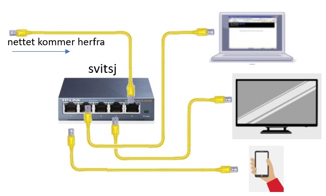 Man setter gjerne en svitsj der man får hentet ut nettet i et rom eller en etasje, for så å kunne koble til flere ting på en gang og evt. også legge en nettverkledning videre til et annet rom.