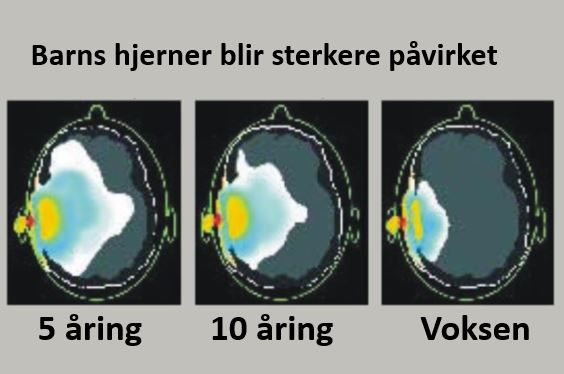 Våre grenseverdier er beregnet for å unngå oppvarmingsskader av en voksen manns og ikke for barn. Det mest kritiske er oppvarmingsskader på hjernen. Der en voksen har skalletykkelse på 2 mm har en 5-åring 0,5 mm og en 10-åring 1 mm. Det gjør at strålene trenger lettere inn i hjernen som medfører mer energitilførsel til selve hjernen. I tillegg er barns hjerner mindre, og dermed når strålene lenger inn i hjernen og når flere vitale deler. LAST NED NETTSIDEN SOM PDF.