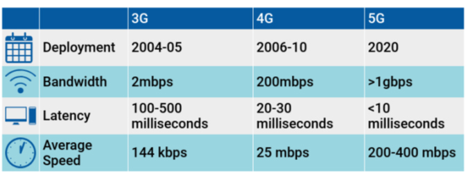 Figur over viser at 5G har større kapasitet (båndbredde) og er mye raskere enn tidligere teknologier. Dette er viktig når man raskt skal sende små meldinger, for eksempel når sensorer skal sende data og andre «smarte» komponenter må ha raske tilbakemeldinger – som hvis automatisk transport skal fjernstyres.