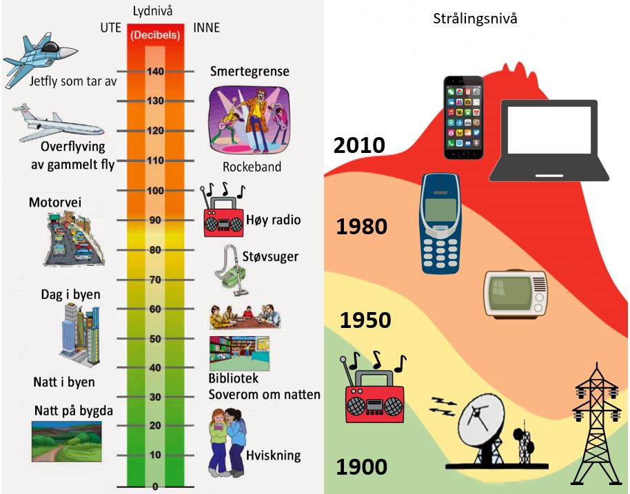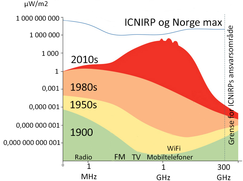 Om vi sammenlikner mengden radiobølger for 130 år siden og mengden vi omgir oss med i dag, med forskjellen i lydbildet kan man forstå hvor utrolig mye mer stråling det er i dag. Hvis vi sier at det var en hvisking for 130 år siden, så står vi i dag under et jettfly som tar av. En slik energiforskjell er begge på ca. en milliard milliard ganger, det vil si 1 000 000 000 000 000 000 ganger.