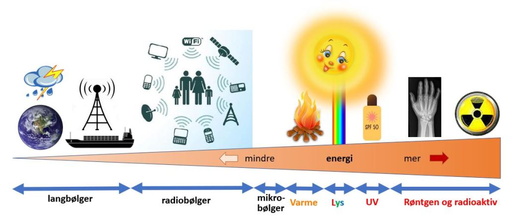 Lys, varme og røntgenstråler er ikke de eneste formene for elektromagnetisk stråling. Mange har hørt om UV-stråler som man blir solbrent av. Det er også elektromagnetiske stråler som har litt mer energi enn lys. Varme har litt mindre energi enn lys. Og røntgen har mye mer energi enn lys. Det finnes tråler med enda mer energi en røntgen, og slike stråler kalles radioaktive og er veldig skadelige for molekylene i kroppen.