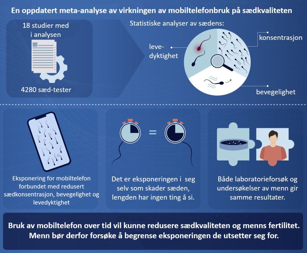 ”Sædtall, motilitet, DNA-integritet, spermienes levedyktighet og morfologi var de mest påvirkede parametere, når menn usettes for RF-EMF. FR1 (450 til 6000 MHz [EMF som sendes ut av mobiltelefoner, WiFi og Bluetooth bl.a.]: Det er tilstrekkelig evidens [forskningsmessig bevis] for sammenhengen mellom RF-EMF-eksponering og negativ effekt på fertilitet hos mennesker. “